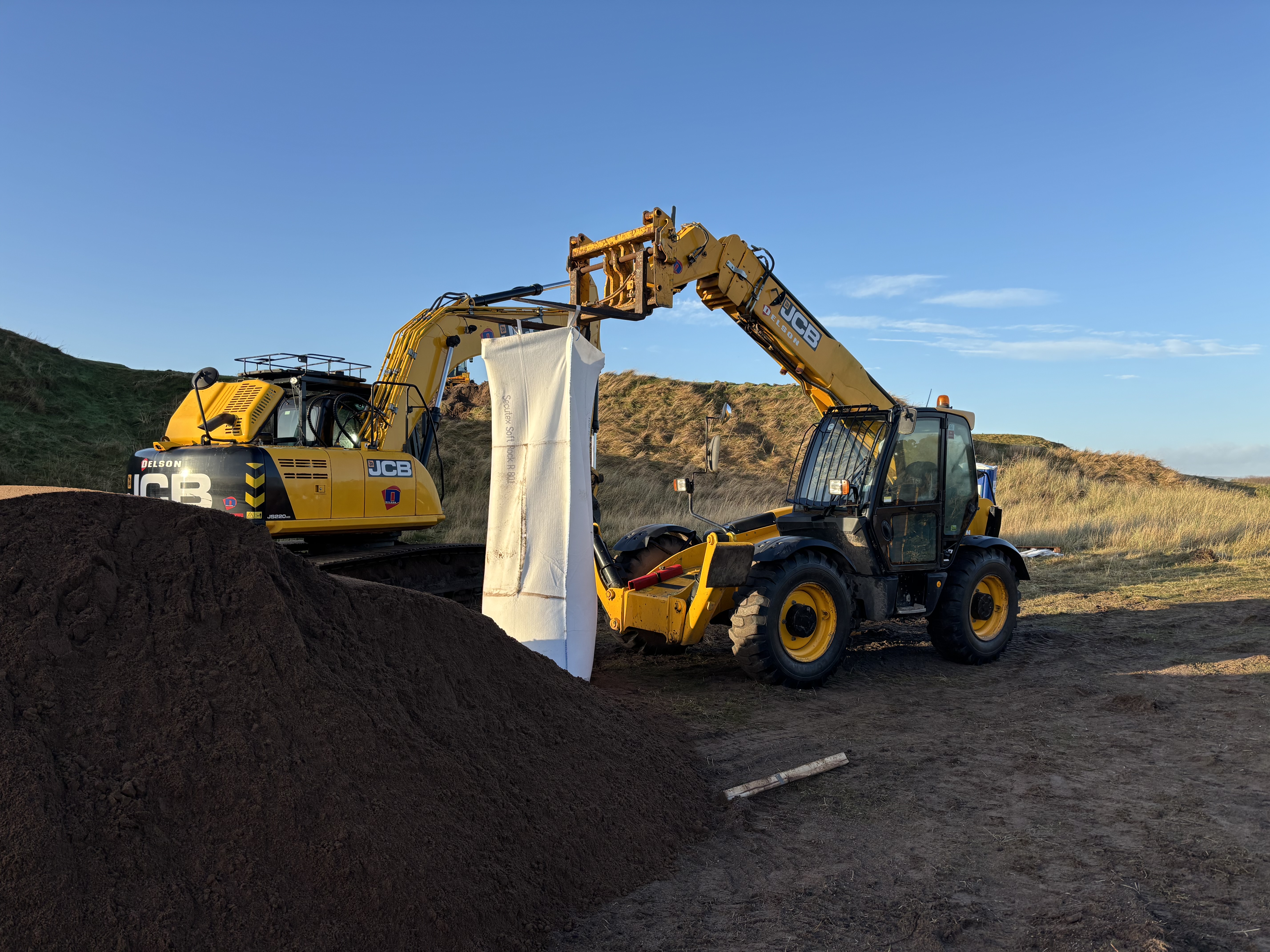 Installation of specially engineered large sandbags to infill the lowest sections of the dunes.